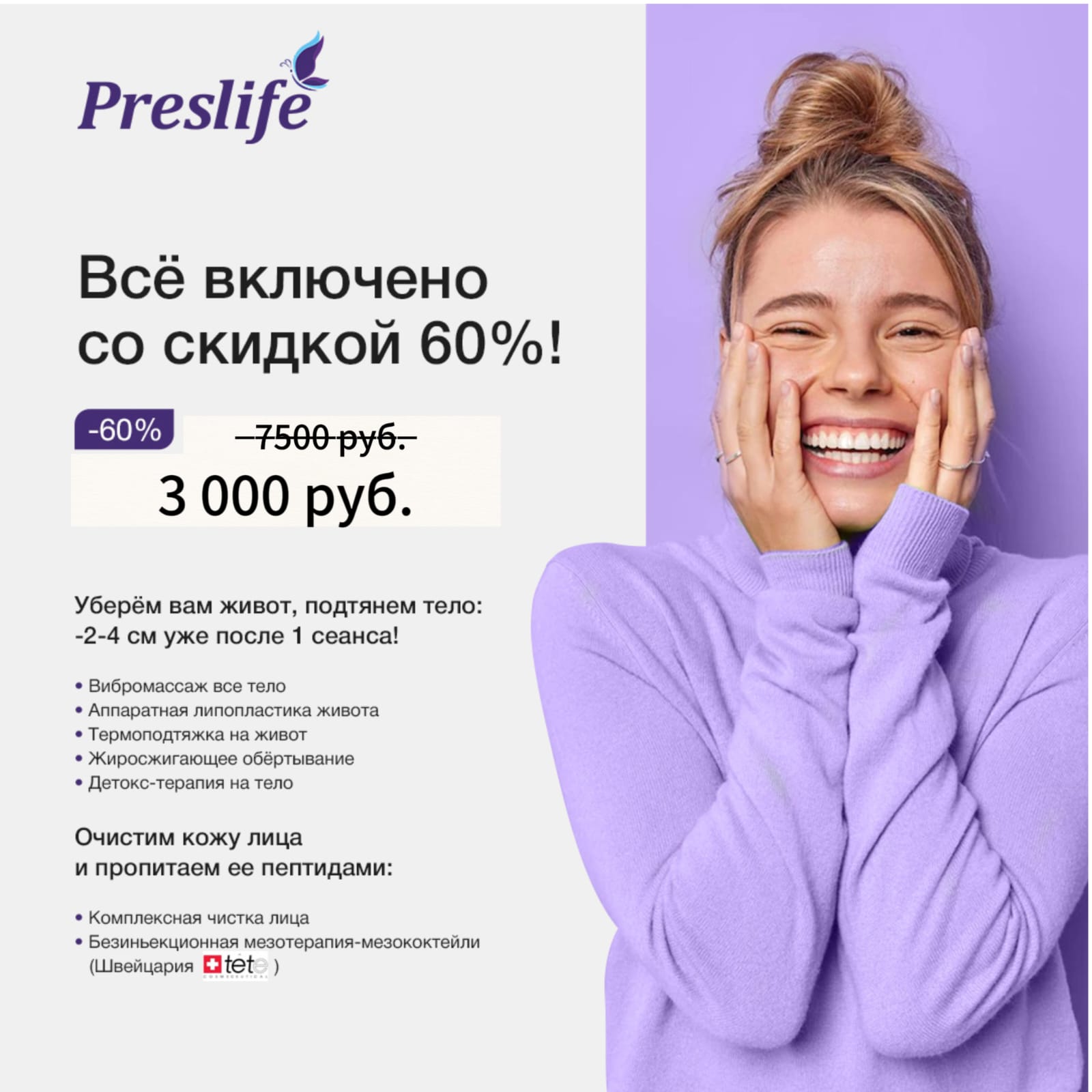 Молодая студия коррекции фигуры и омоложение "Preslife" в Вологде! Специалисты студии – эксперты в своём деле, грамотно проконсультируют и подберут процедуру или индивидуальную программу преображения по уходу за лицом и телом! Самые эффективные и безопасные процедуры для здоровья в Preslife!